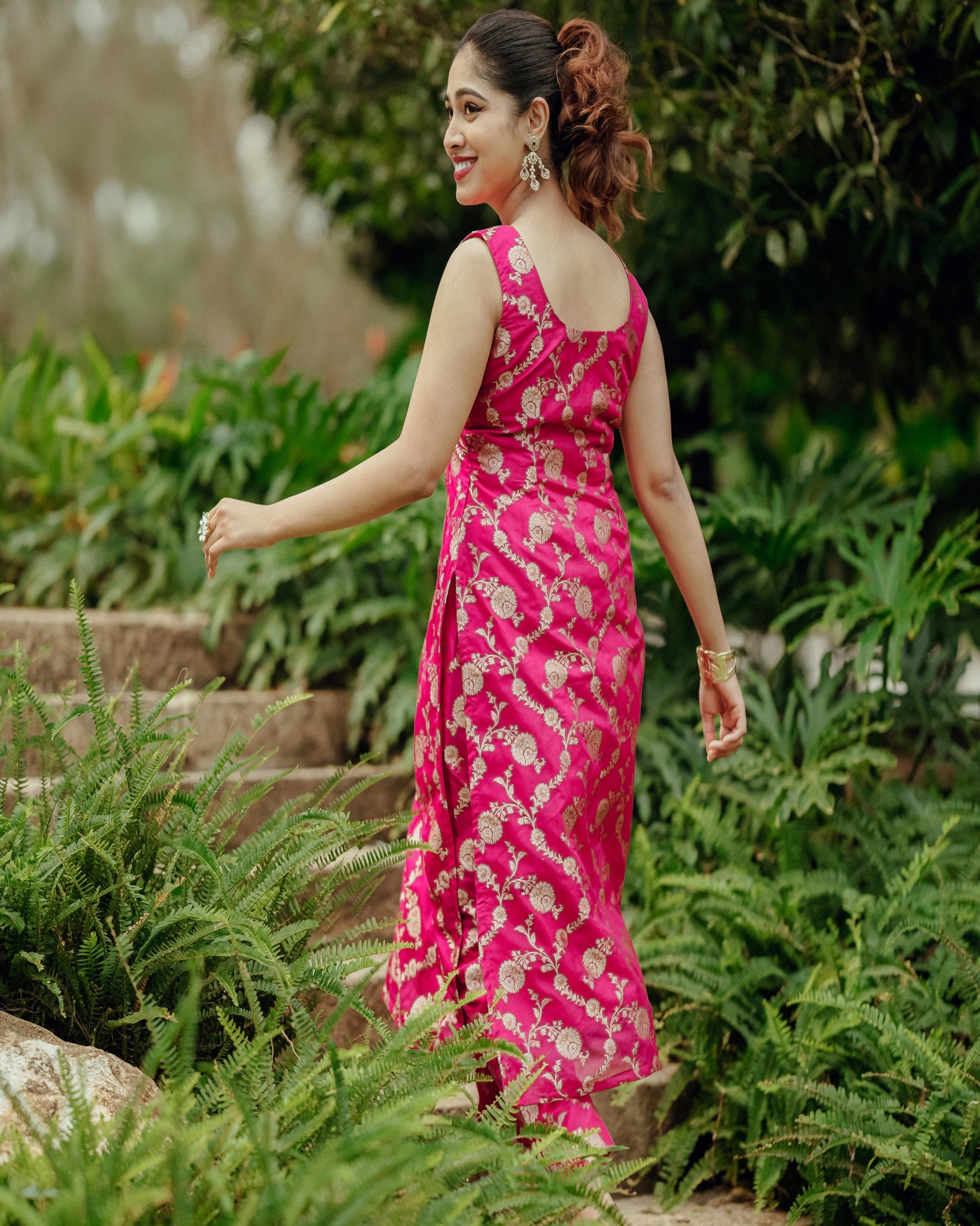 The Blooming Aura Mystaraluxe Signature Dress showcases the elegance of Chanderi silk enhanced with intricate embroidery. This lightweight fabric is prized for its natural sheen and delicate texture, providing a luxurious feel. To preserve its richness and fine craftsmanship, dry cleaning is recommended. Additionally, this dress can be dyed in light shades, allowing for subtle customization while maintaining its sophisticated appeal. Ideal for those seeking timeless elegance combined with expert care.